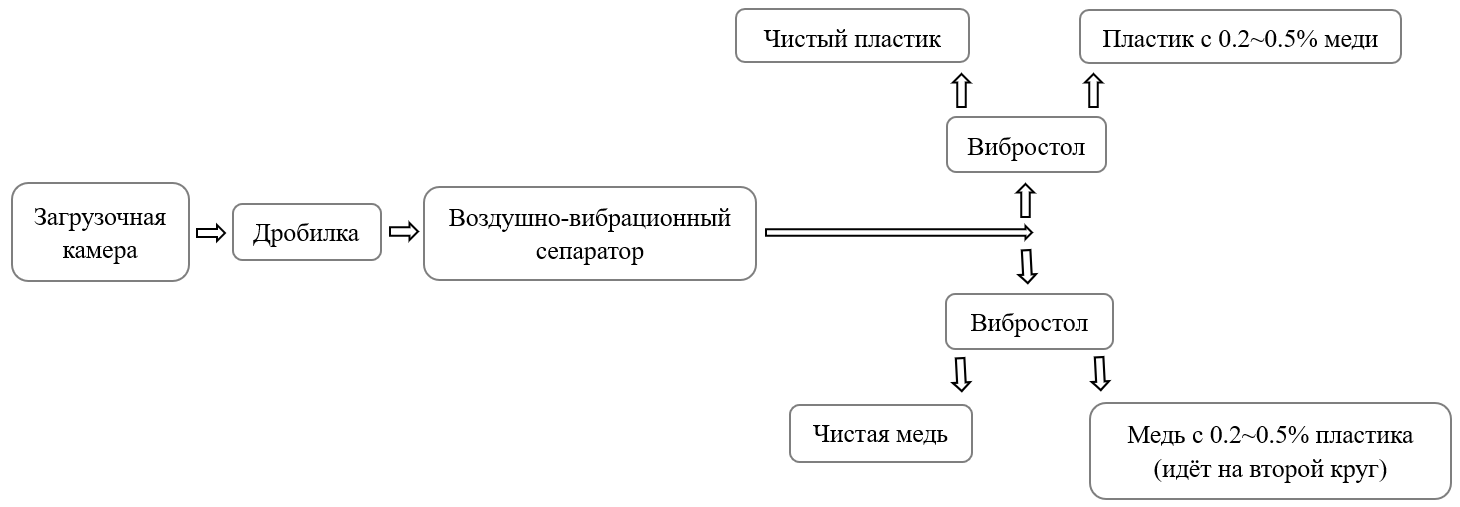 Провода загружаются в оборудование, где путем измельчения ножами и дальнейшей сепарации (воздухом на вибростоле), разделяются на две фракции: на изоляционную и металлическую сечку (крошку). Процент сепарации достигает 99,9%. Таким образом, на выходе получается два готовых чистых продукта для последующего использования. Металлическую сечку можно напрямую отправлять на заводы для переплавки, а пластик использовать для вторичных целей. Пыль воздуховодом собирается в пылесборнике.