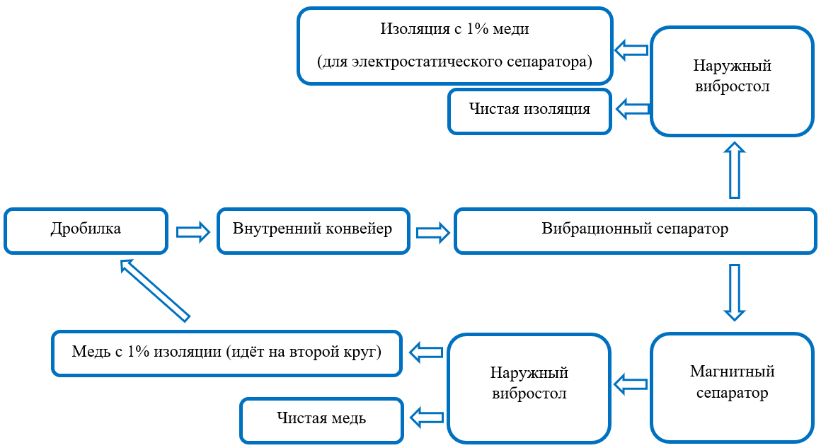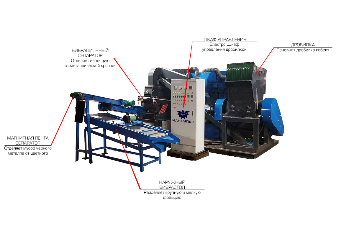 - Измельчитель (дробилка), в котором происходит процесс дробления кабелей;