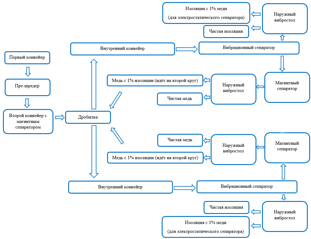 - Измельченный материал попадает на два сепаратора. За счет воздушно-вибрационной сепарации изоляция отделяется от металлической сечки.